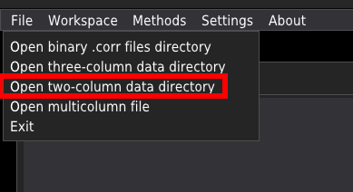 The .dat files containing the tab-separated two-column data; time, and the correlation data. To import the data folder, click Open two-column data directory in the File menu.
