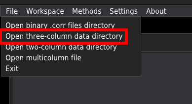 The .dat files containing the tab-separated three-column data (time, correlation, and the correlation error). Those files can be obtained by exporting the correlated data from the acquisition software (tested with SymPhoTime64 from PicoQuant). To import the folder containing the files, click the Open three-column data directory in the File menu.
