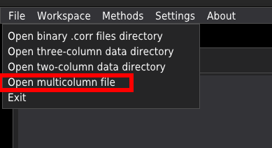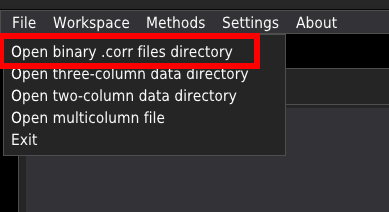 The software reads files containing correlation data from a given folder. It is therefore recommended to keep the correlation data for a series of measurements in a single folder. The software reads several file types, and each has its own position in the File menu.