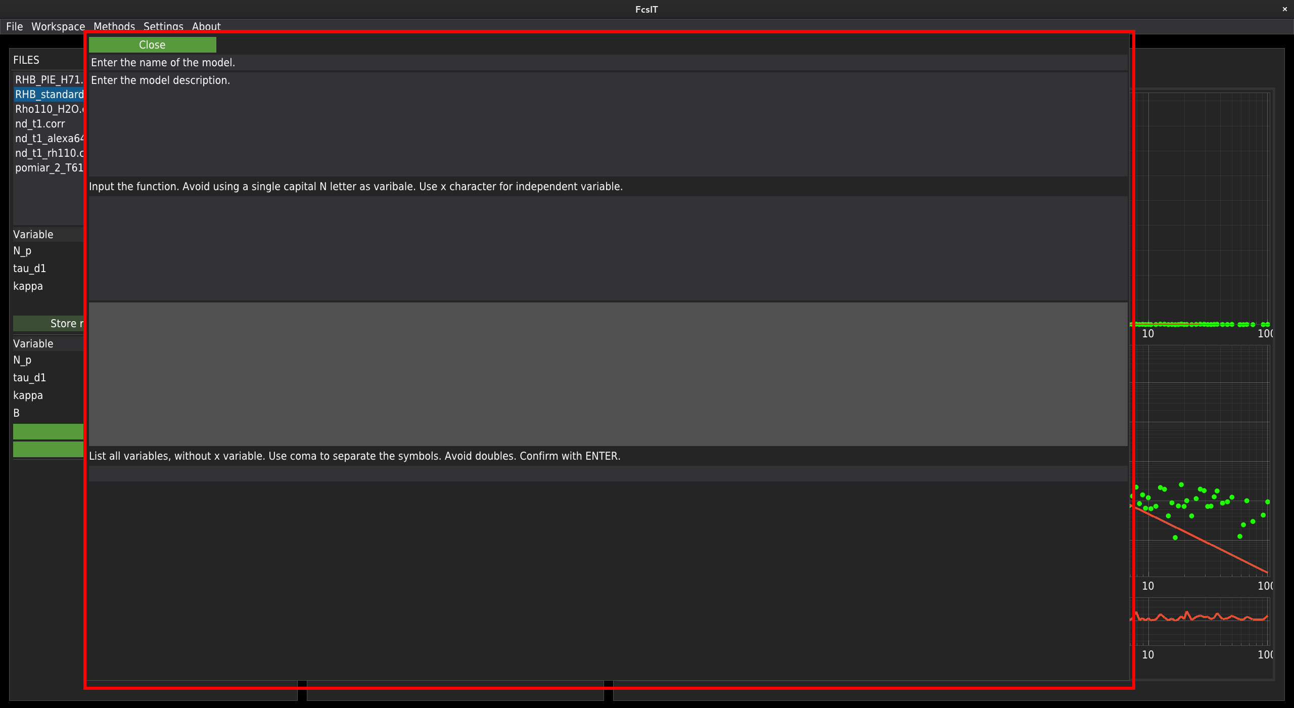 Before the provided model is added to the library, the software will double-check the variables used in the model’s equation. For this purpose, the user is asked to provide a list of variables (separated by commas and excluding the x variable). If the user-provided list of variables matches the list of variables extracted from the user-defined model’s equation, a set of editable fields labelled with the variable names will appear at the bottom of the window.