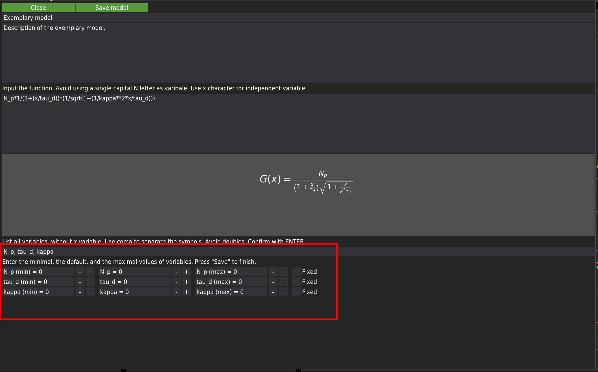 Here, the user is advised to provide the minimum expected value, the initial value, and the maximum expected value. All fields need to be filled. Keeping the default zero values can lead to fitting errors. Each variable has a checkbox marked as Fixed. By default, if the checkbox is checked, the variable will be kept constant during fitting. If the list of user-provided variables agrees with the list of variables extracted from the model’s equation, the Save model button will appear. Press it to add the model to the library. The user-defined model will appear in the list of models and will be labelled as User-defined -.