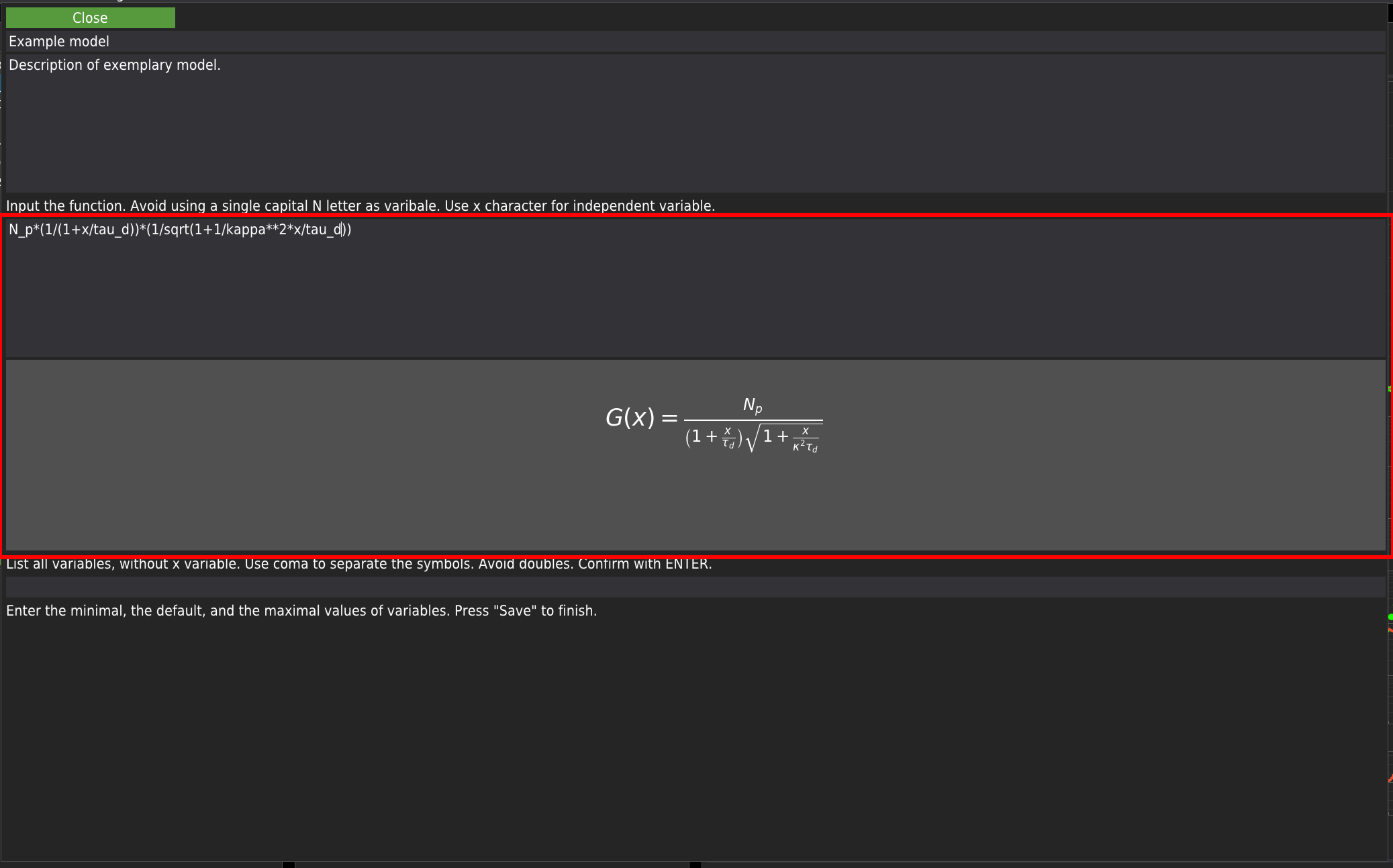 In the first two fields, at the top of the window, the user needs to provide the model’s name and a short description. Next, the equation describing the model should be provided. The edited equation is rendered on the flight in the field below. Due to technical reasons, avoid using capital N while editing the equation. The underscore mark can be used for indices. The power operation should be provided in a Python notation - a double asterisk character (**) instead of the caret (^) character. All operators should be provided, including the multiplication operator marked by the asterisk character. Use x as the independent variable. Note that the equation will not update if an error in the equation formula is detected. In the screenshot below, you can see an example input.