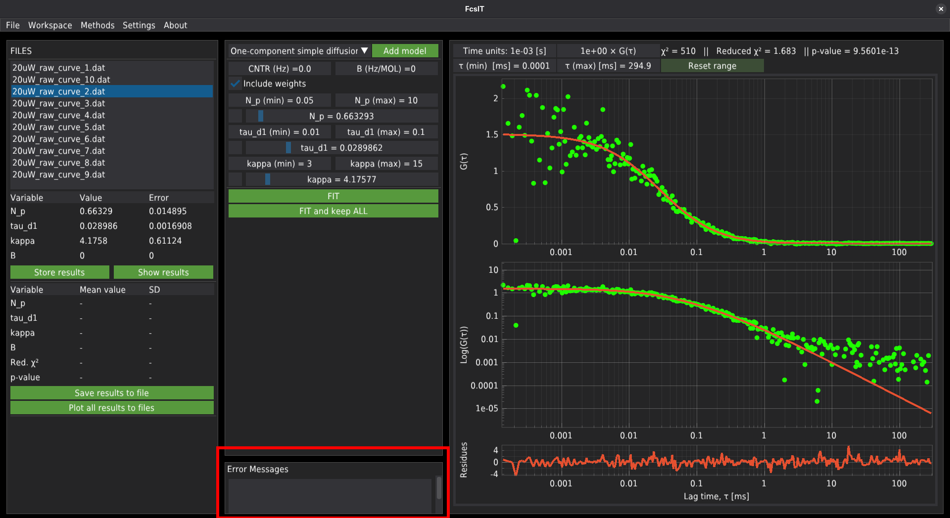 When the FIT and keep ALL button was pressed to fit the data, the software would fit the curve and automatically add the results to the database. In some cases, the fitting algorithm may not find proper values. In such cases, the software will report an error in fitting a given file, which will appear in the Error Messages window at the bottom of the central panel. Clicking the record displayed in that window will automatically jump to the file. Then the user can adjust the initial parameters and fit the single file. If the fit succeeds, the error message will disappear. In that case, the data needs to be stored manually which may lead to double te reusults records in the database.