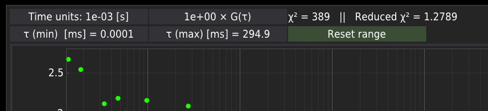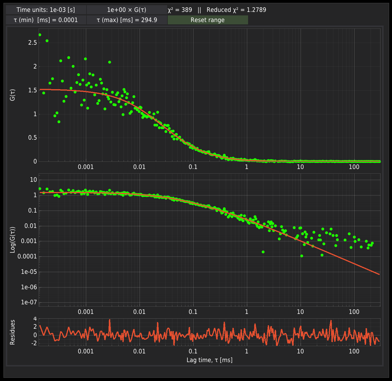 (min) and (max) sliders. Those two fields allow the lag time range to change. Changes in the values affect the range of data used for fitting.