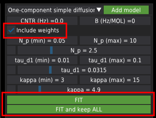To fit the single file, press the FIT button. To fit all files from the list, press the FIT and keep ALL button. By default, the fitting algorithm will include weights (as the inverse of the error ) from the data file. The user can switch off this option by unchecking the Include weights checkbox.