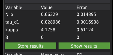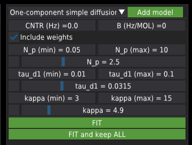 Below, there are fields related to model variables. Each variable has four fields: the minimum value, the maximum value, the fixed checkbox, and the value slider. The minimal and maximal values provide the fitting algorithm with a range to search for the solution. The user can change the values by double-clicking, Ctrl+clicking, or dragging with the mouse. The fix checkbox is located in the lower row of each variable’s section on the left-hand side of the variable’s value field. When checked, the fitting algorithm will keep the variable constant. The value slider defines the initial value of the variable used for fitting. The user can move the slider to pre-adjust the initial fitting value. Pre-adjusting is strongly advised, especially when the models have many variables, as this can make the fitting algorithm unstable and lead to errors. After fitting, the value slider will display the fitted value.