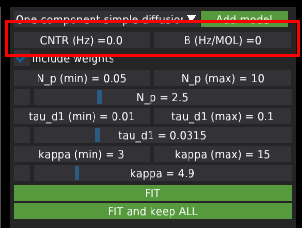 The first row of the list corresponds to the count rate and the molecular brightness, , given in Hz per molecule. is calculated from the value of countrate and the mean number of molecules in the focal volume .