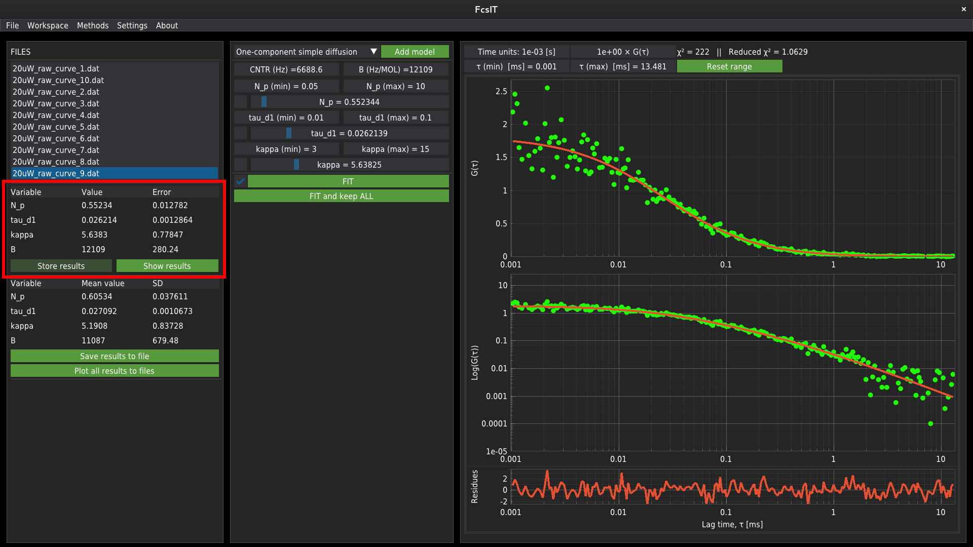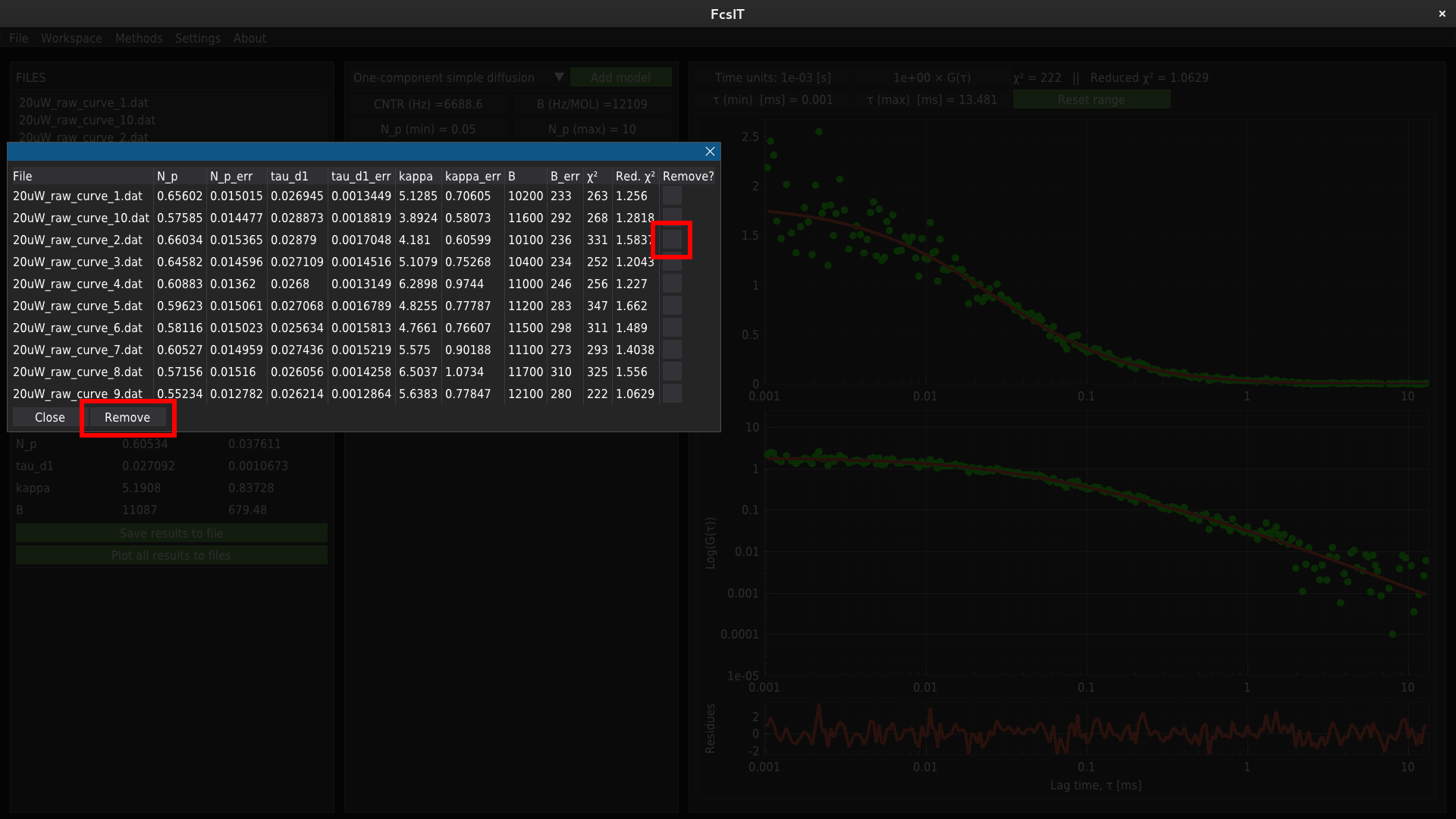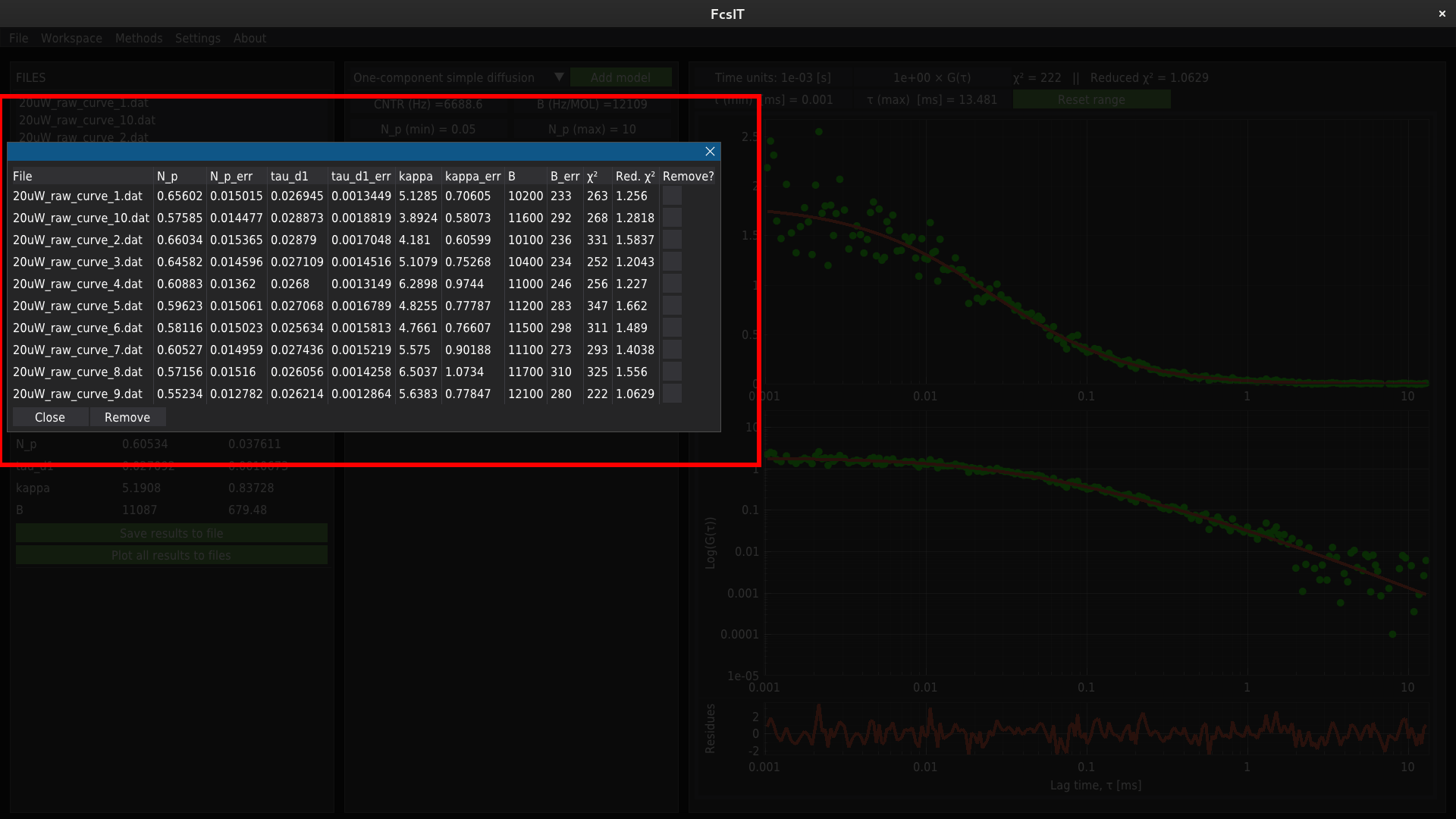 When a single file is fitted, the results are displayed in the table on the left panel.