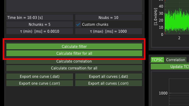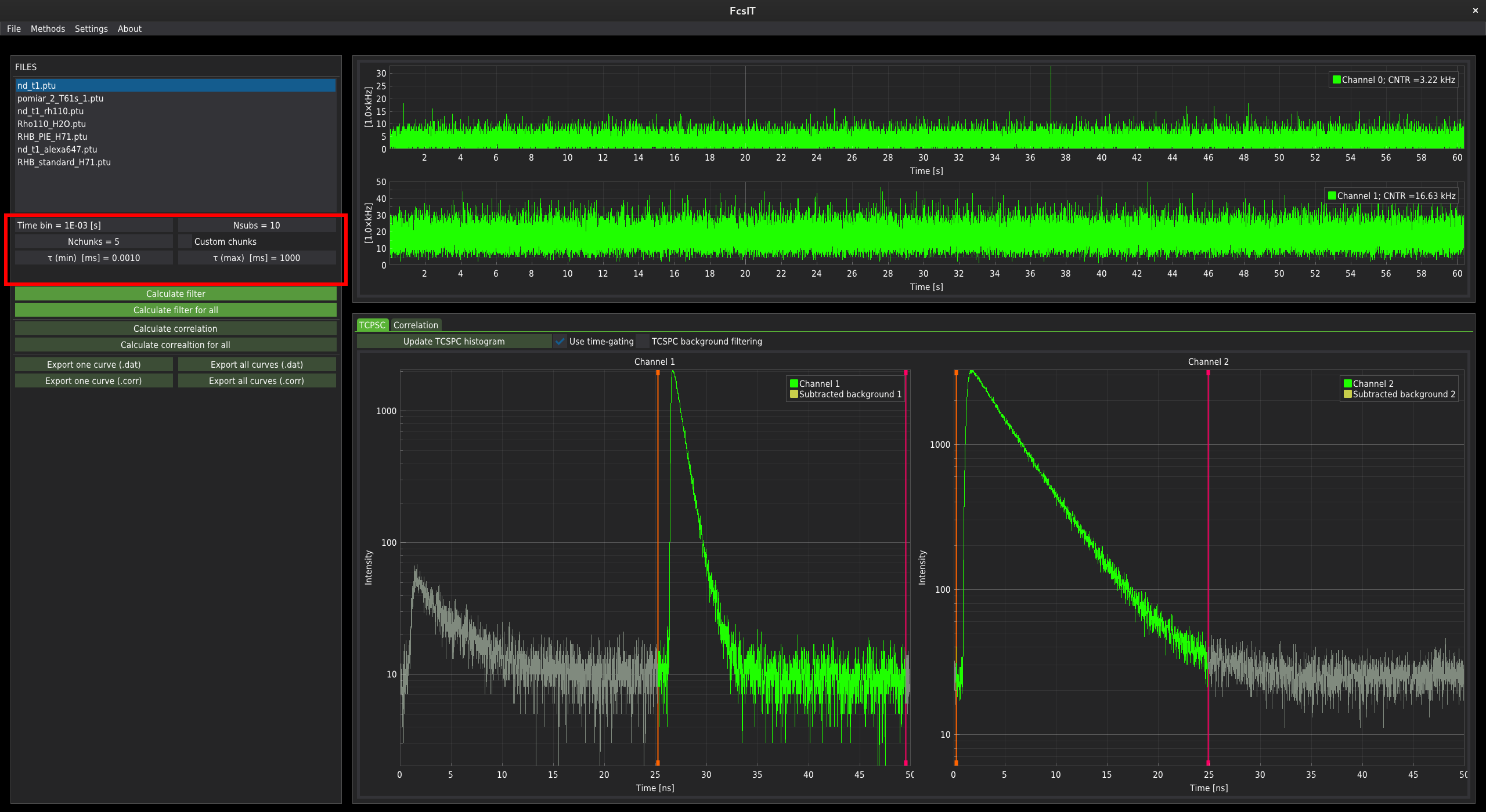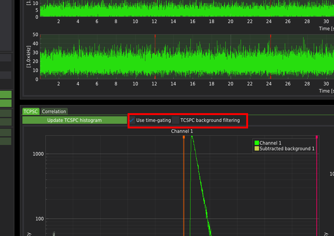 First, the imported .ptu file needs to be filtered. The filtration method can be selected by checking/unchecking the checkboxes Use time-gating or TCSPC background filtering.