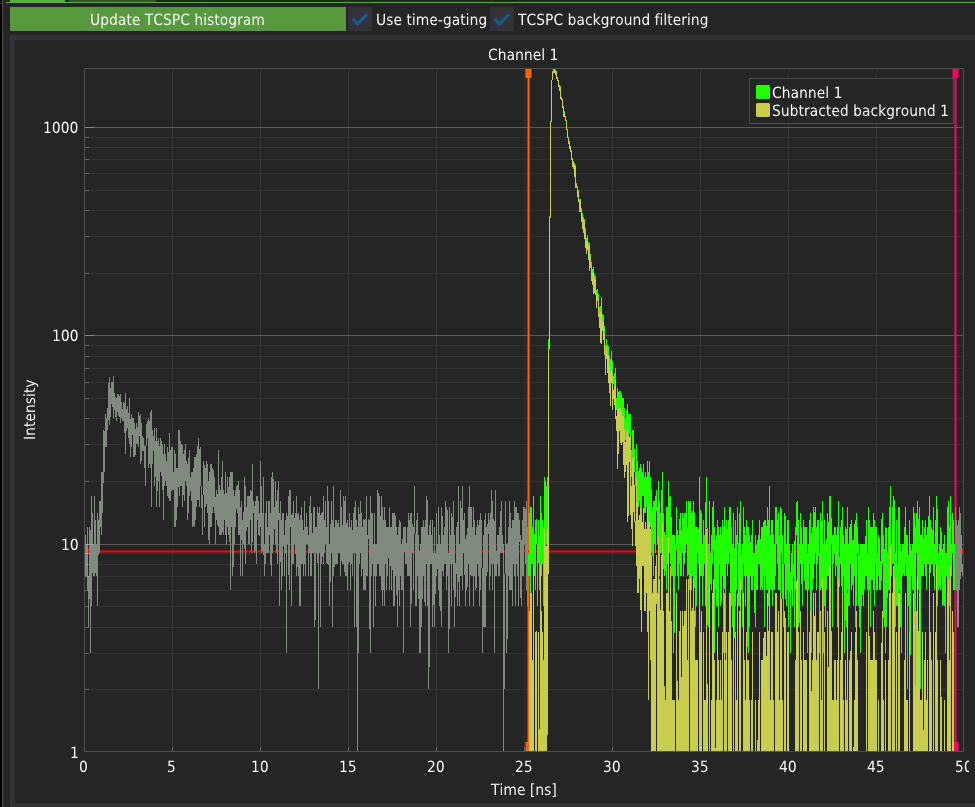 TCSPC background filtering uses the algorithms and methods described in the literature: Enderlein & Gregor (2005), Kapusta et al. (2007). The level of background taken into account during filtering can be selected by moving the horizontal drag line on the TCSPC histogram.
