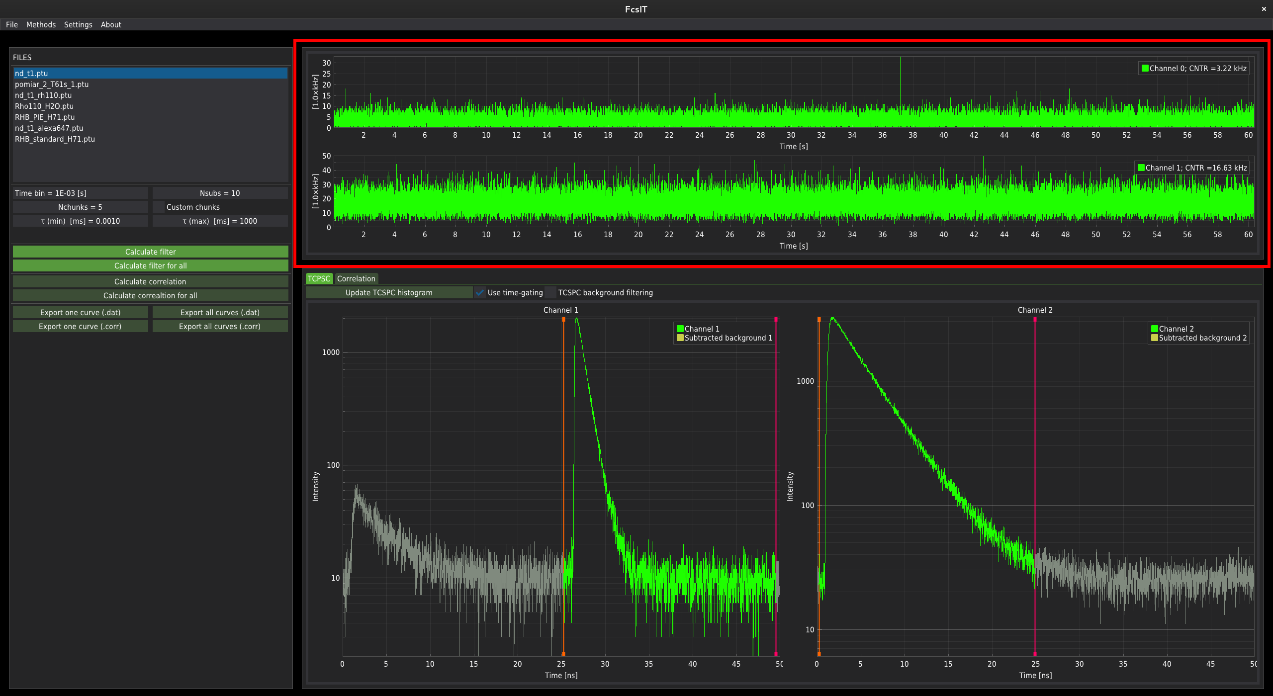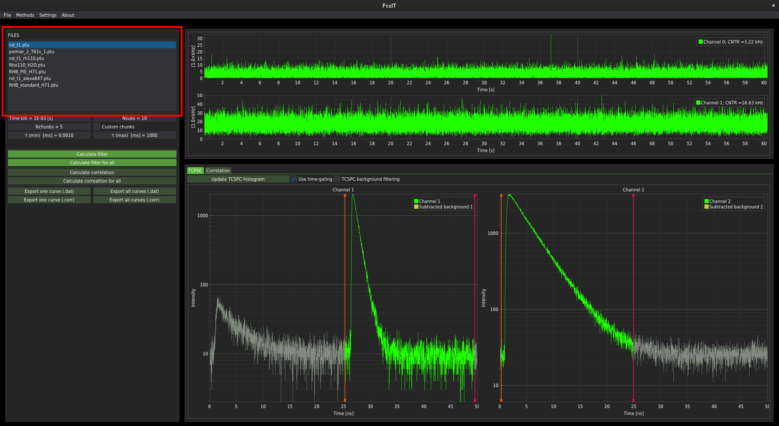 For data with a single fluorescence channel, only one plot is displayed. For two channels, the two separate time-traces are plotted. In the control panel on the left-hand side of the window, below the list of files, the correlation parameters controllers are located.
