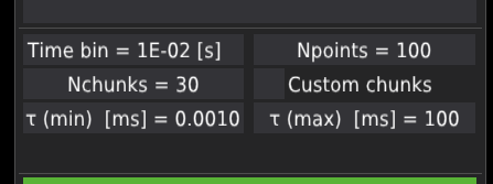 The Nchunks field defines the number of chunks to which the whole time-trace signal is divided. The chunks are used to determine the mean and standard error of the mean for each lag-time point along the correlation curve; for details, see the preprint Kalwarczyk (2026). By default, the time-trace is divided into thirty evenly distributed chunks.