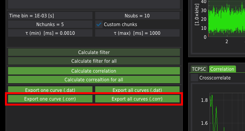 .corr format is a binary format consisting of the same data as in the case of the ASCII files. Additionally, the .corr files include the average count rate (averaged across all chunks) and the correlation curves calculated for each chunk. The mean count rate is particularly useful for calculating the molecular brightness of the probe when fitting with the FCS fitting module.