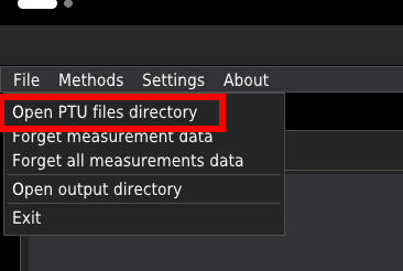 The software recognises all .ptu files in the given folder. The user is advised to consolidate all _.ptu_files related to the given experiment into a single folder. Press Open PTU files directory in the File menu to open the folder.