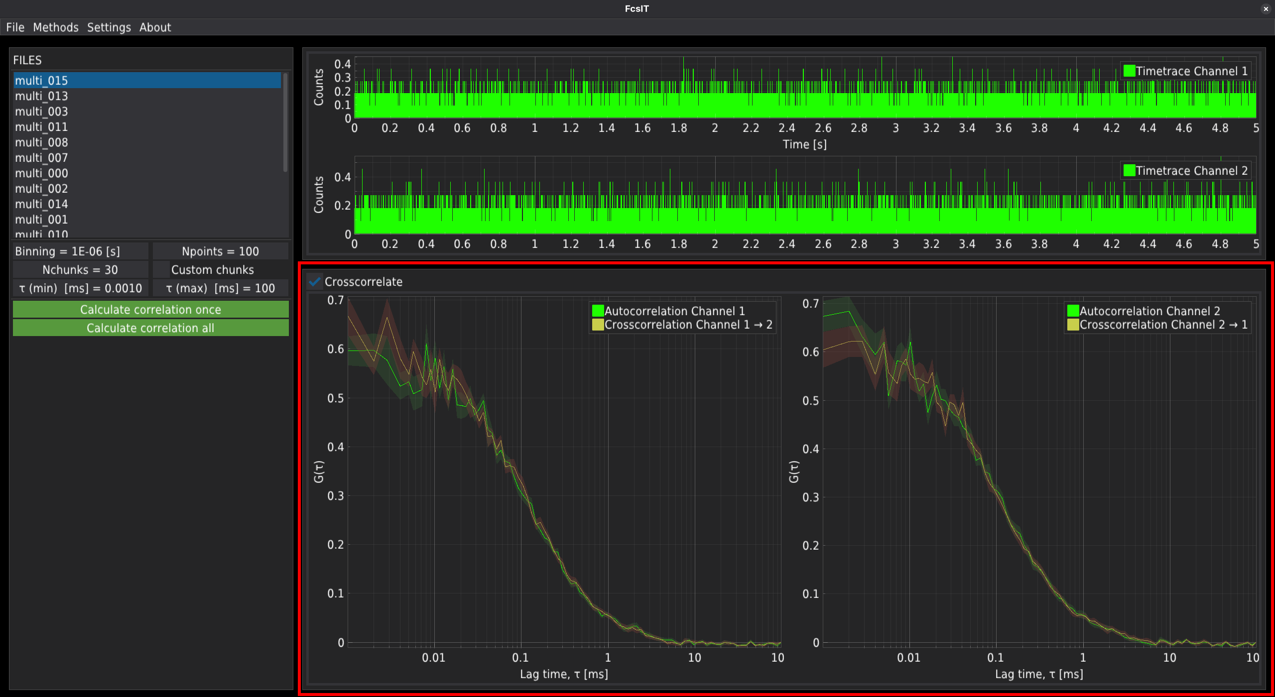By pressing the Calculate correlation once button, the correlation curve(s) will be calculated and automatically exported to the output subfolders just for a single selected file. Pressing the Calculate correlation all button performs the same operations on all files in a folder.