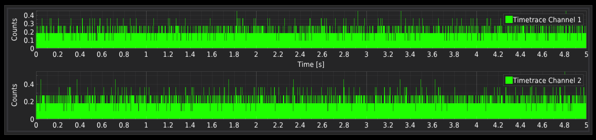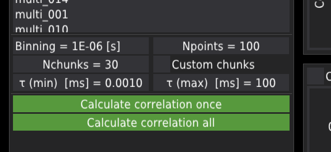 The Custom chunks checkbox activates/deactivates user-defined chunks. When activated, the draglines and green fields appear on the time-trace plots. The user can unselect part of the signal that won’t be included in the analysis. The length of chunks influences the calculated maximum lag-time of the correlation curve.