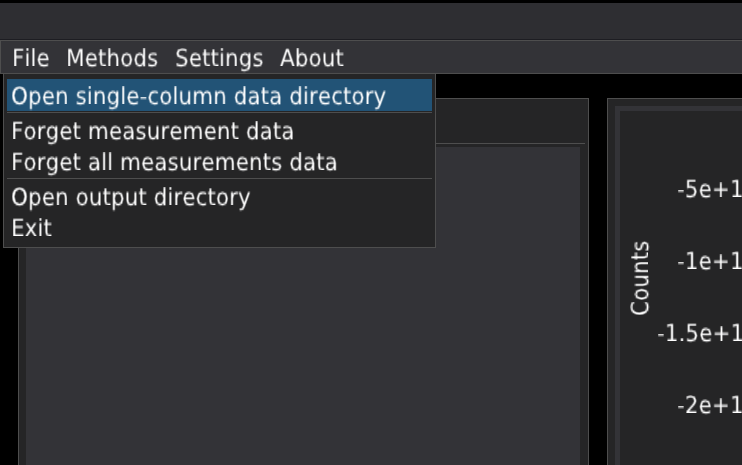 In the file menu, click Open single-column data directory. It will start the dialogue window where you can select the folder containing your time-trace data. The software reads the time-trace data stored in the .txt files. For single-fluorescence-channel data, the file name does not matter except for the .txt extension. If the folder contains two-colour data, the file names should correspond to the channel. For example, some_name_c0.txt and some_name_c1.txt files correspond to data from channel 1 and channel 2, respectively. After importing the two-colour data, the file names will be displayed in the file list only as some_name.