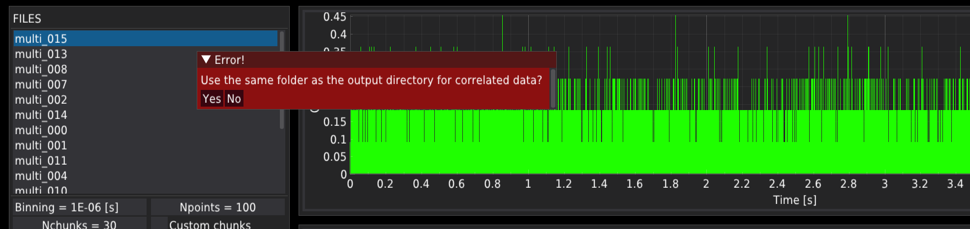 After opening the data folder, the program will prompt you to select the output data folder. Press Yes to create the output subfolder in the same folder as the time-trace data are located. Press No to select the output folder manually.